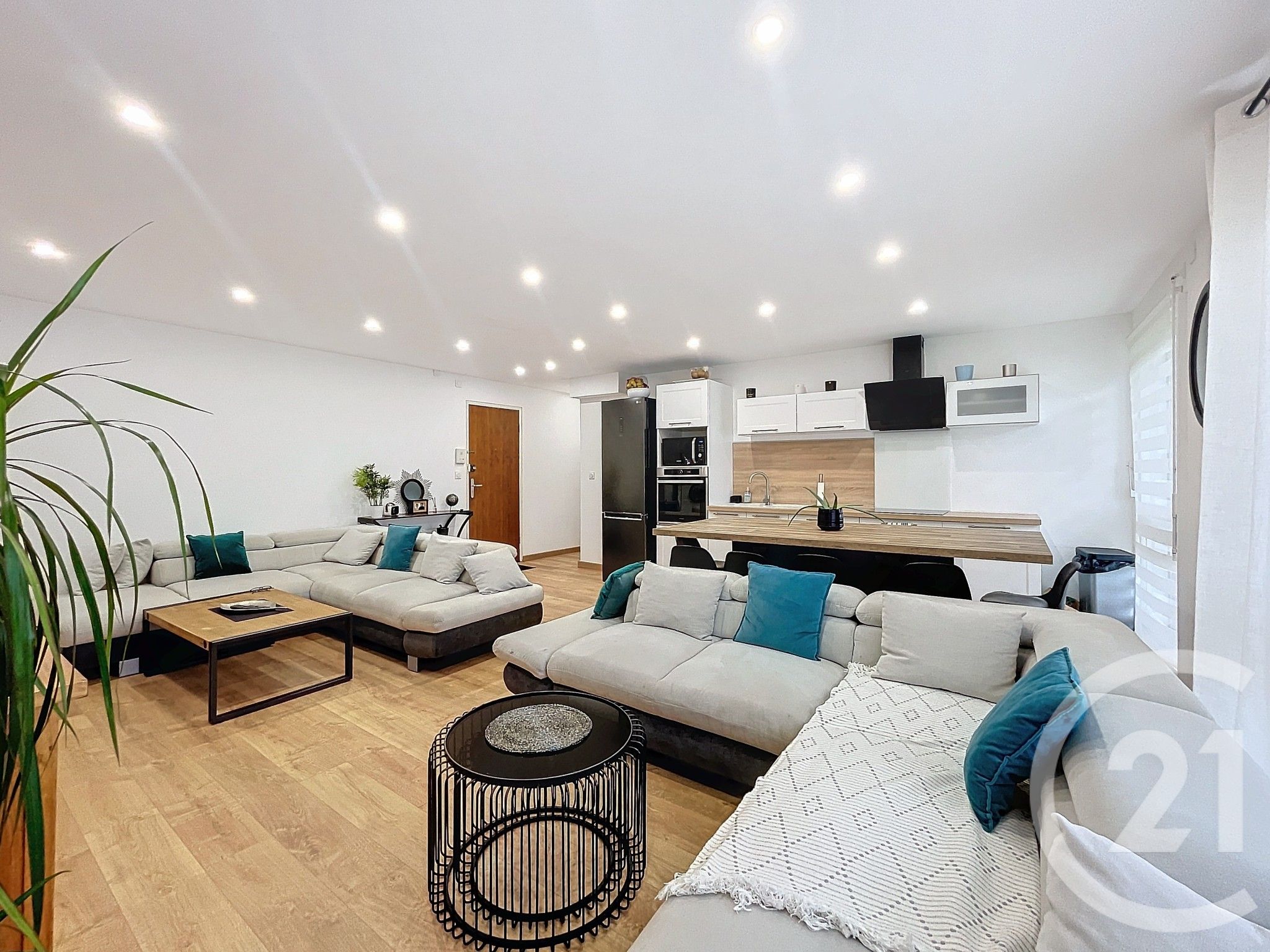 La cuisine ouverte, aménagée et équipée, s'intègre parfaitement à cet espace convivial et fonctionnel.
